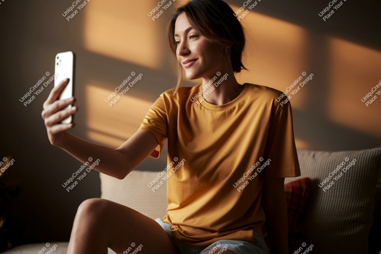 Light Shadow Casual Woman Golden Phone Indoor Selfie Couch Relaxed