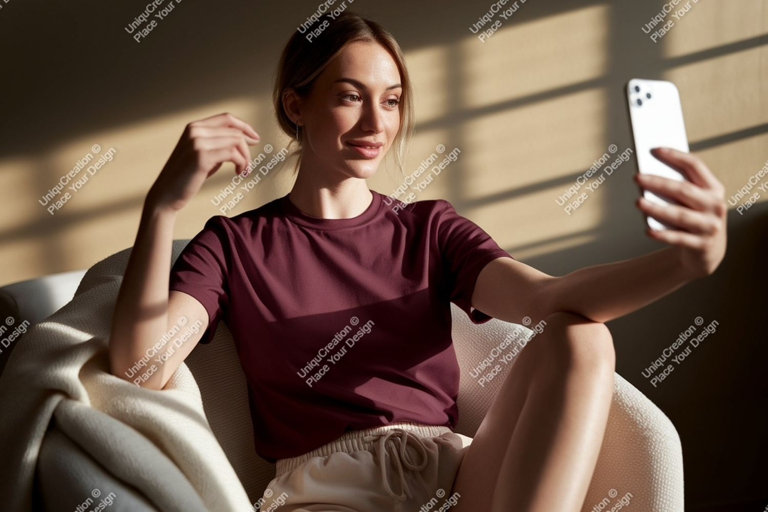 Shirt Woman Chair Blanket Phone T Indoor Selfie Maroon Shorts