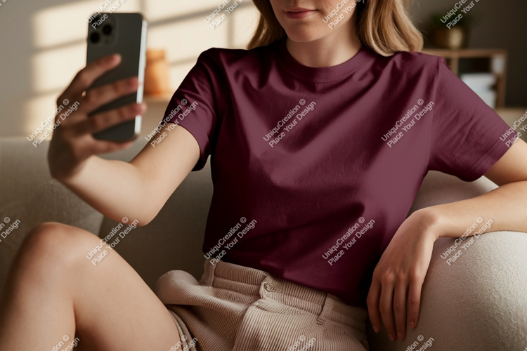 T-shirt Casual Mockup Woman Holding Phone Indoor Maroon Couch