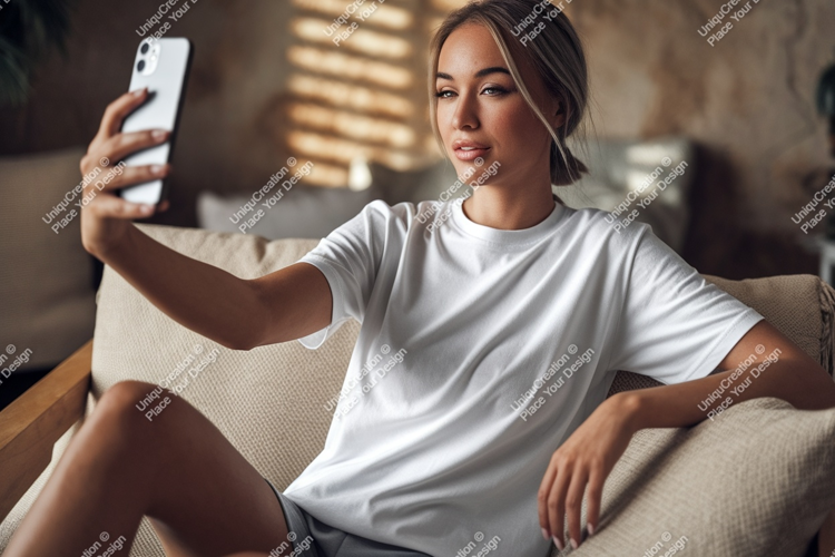 T-shirt Casual Woman White Home Phone Indoor Selfie Couch Relaxed