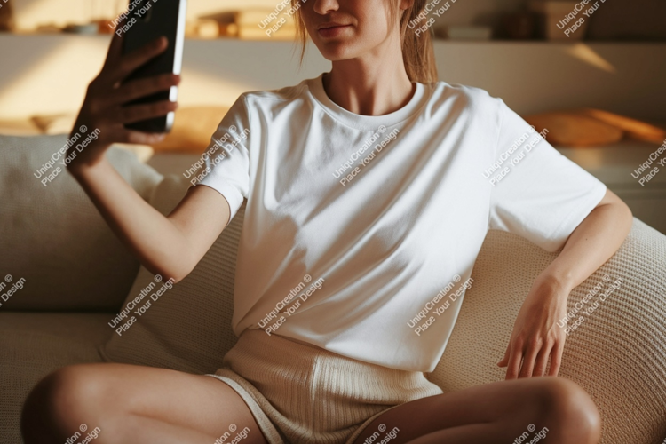 T-shirt Casual Mockup Woman Phone Indoor Selfie Couch Relaxed Shorts