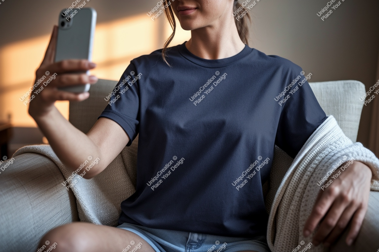 Shirt Casual Woman Dark Blue Chair Blanket Phone T Selfie