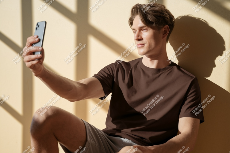 Similar Design Products to Young man taking selfie wearing brown t shirt phone