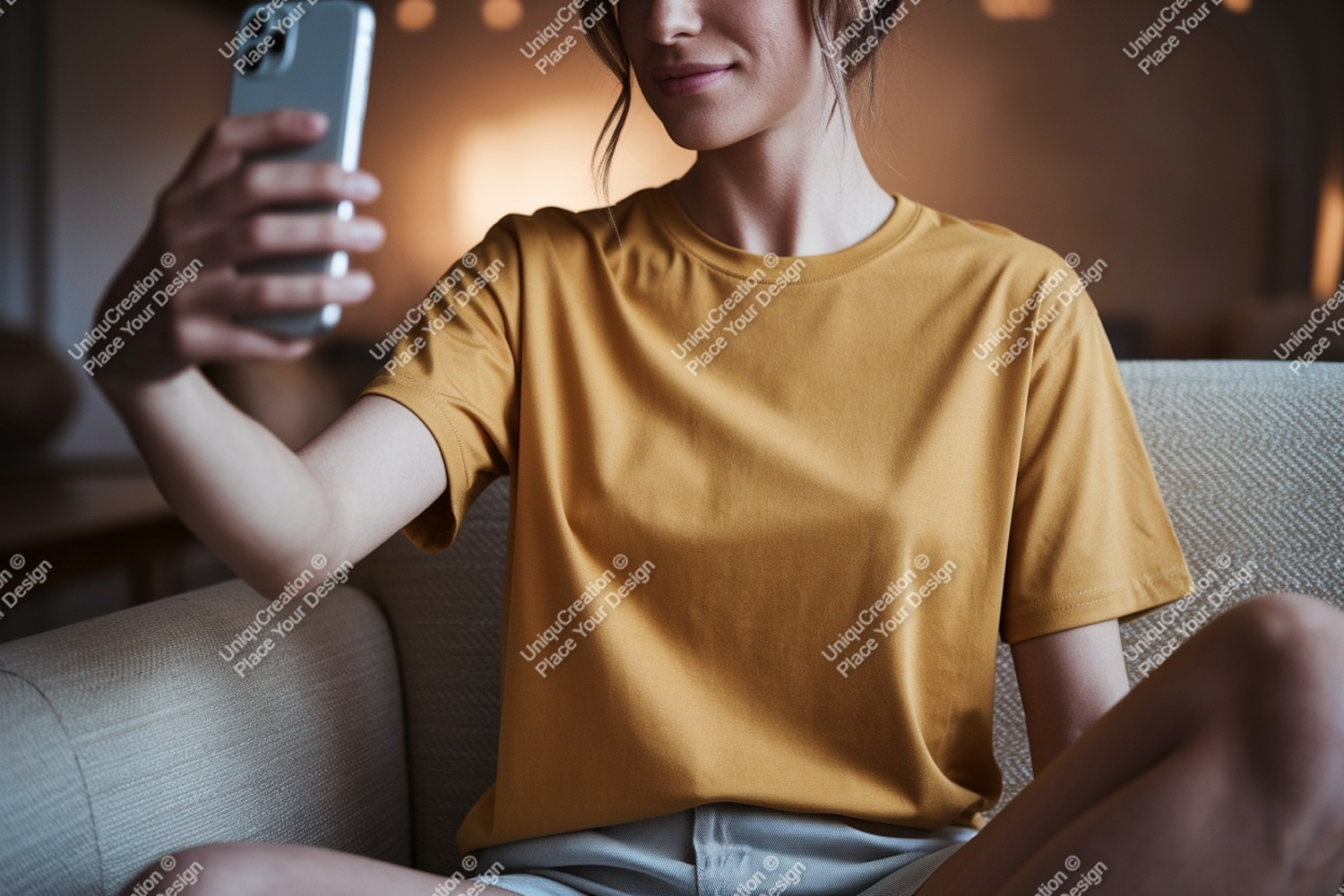 Shirt Casual Woman Phone Indoor Comfortable Selfie Couch Relaxed Mustard
