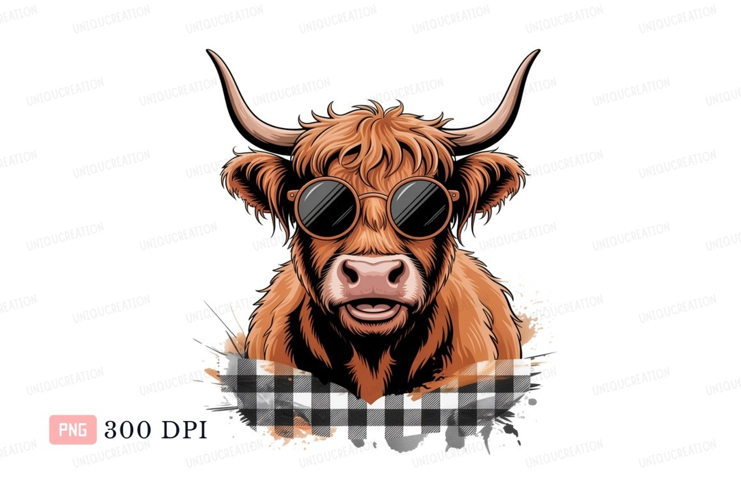 Similar Design Products to Format: Title: Highland cow wearing sunglasses and plaid