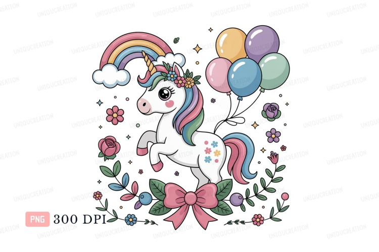 Unicorn rainbow flowers balloons pink example image 1