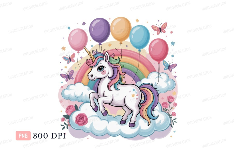 Magical unicorn with rainbow and balloons clouds butterflies example image 1