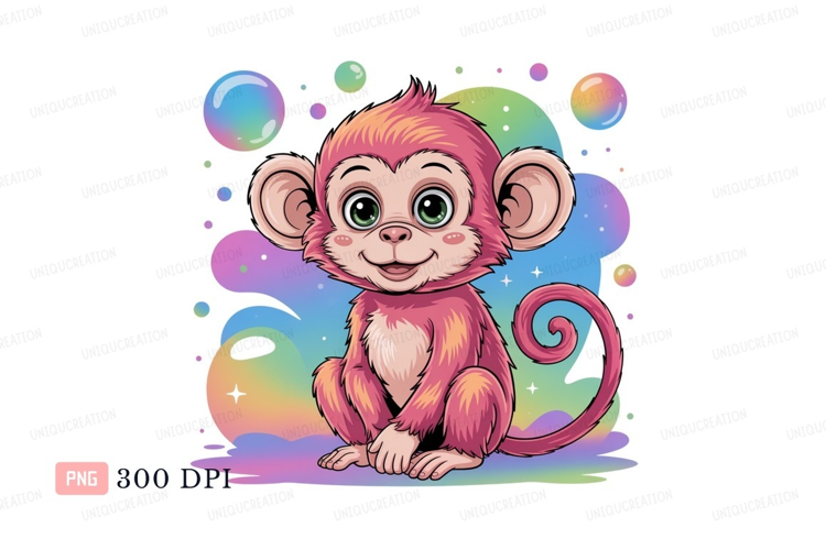 Pink monkey with big eyes and bubbles cute cartoon example image 1