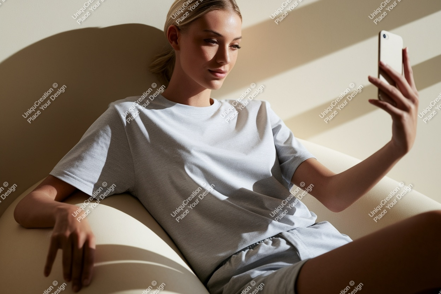 Light Casual Woman Home Grey Phone Indoor Selfie Couch Relaxed