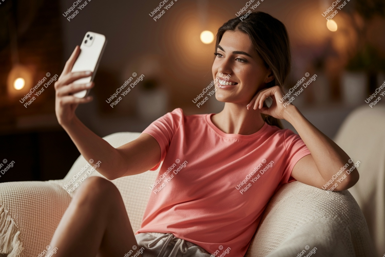 Casual Happy Woman Peach Phone Smiling Indoor Selfie Relaxed Sofa