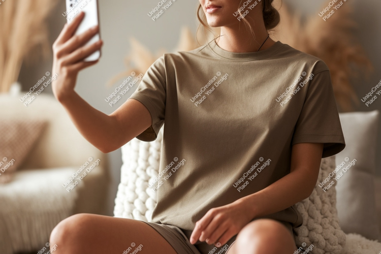 Woman taking selfie in casual outfit phone t-shirt example image 1