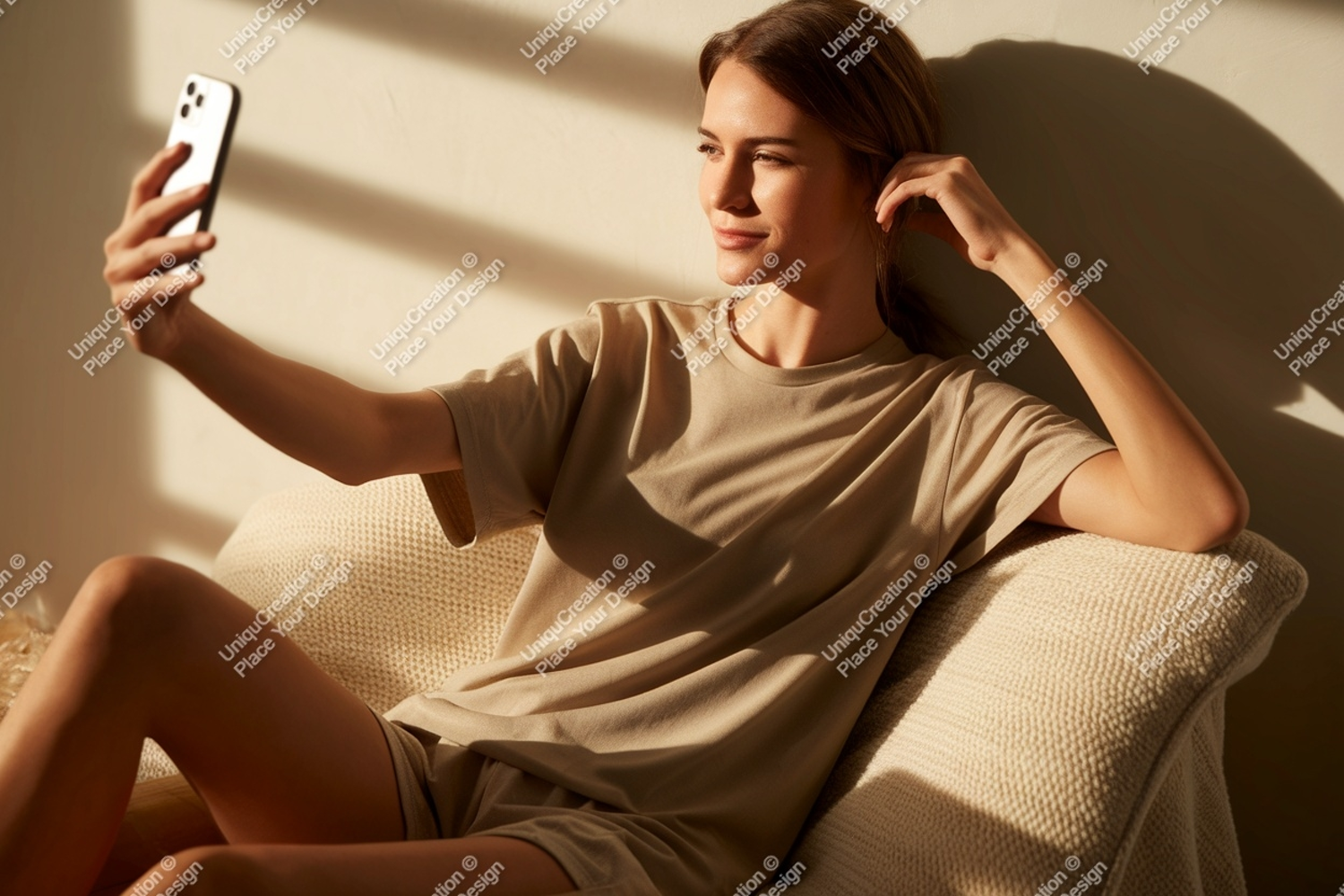 Casual Woman Home Phone Shadows Indoor Selfie Sunlight Couch Relaxed