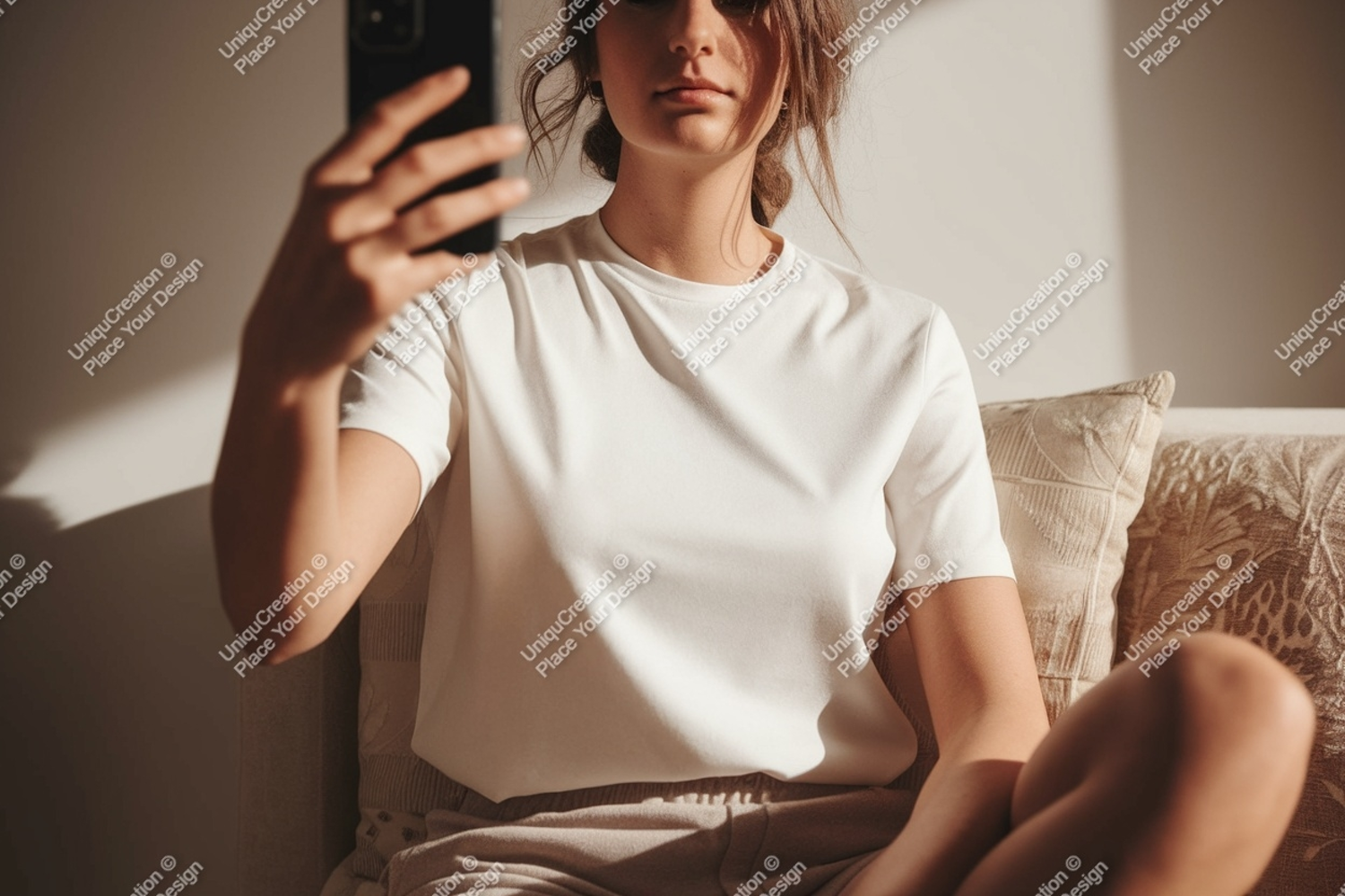 Light T-shirt Casual Woman White Pillow Phone Indoor Selfie Couch