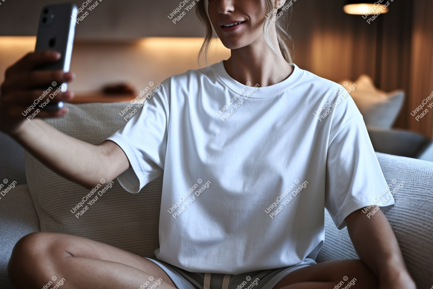 T-shirt Casual Woman White Grey Phone Indoor Selfie Couch Shorts