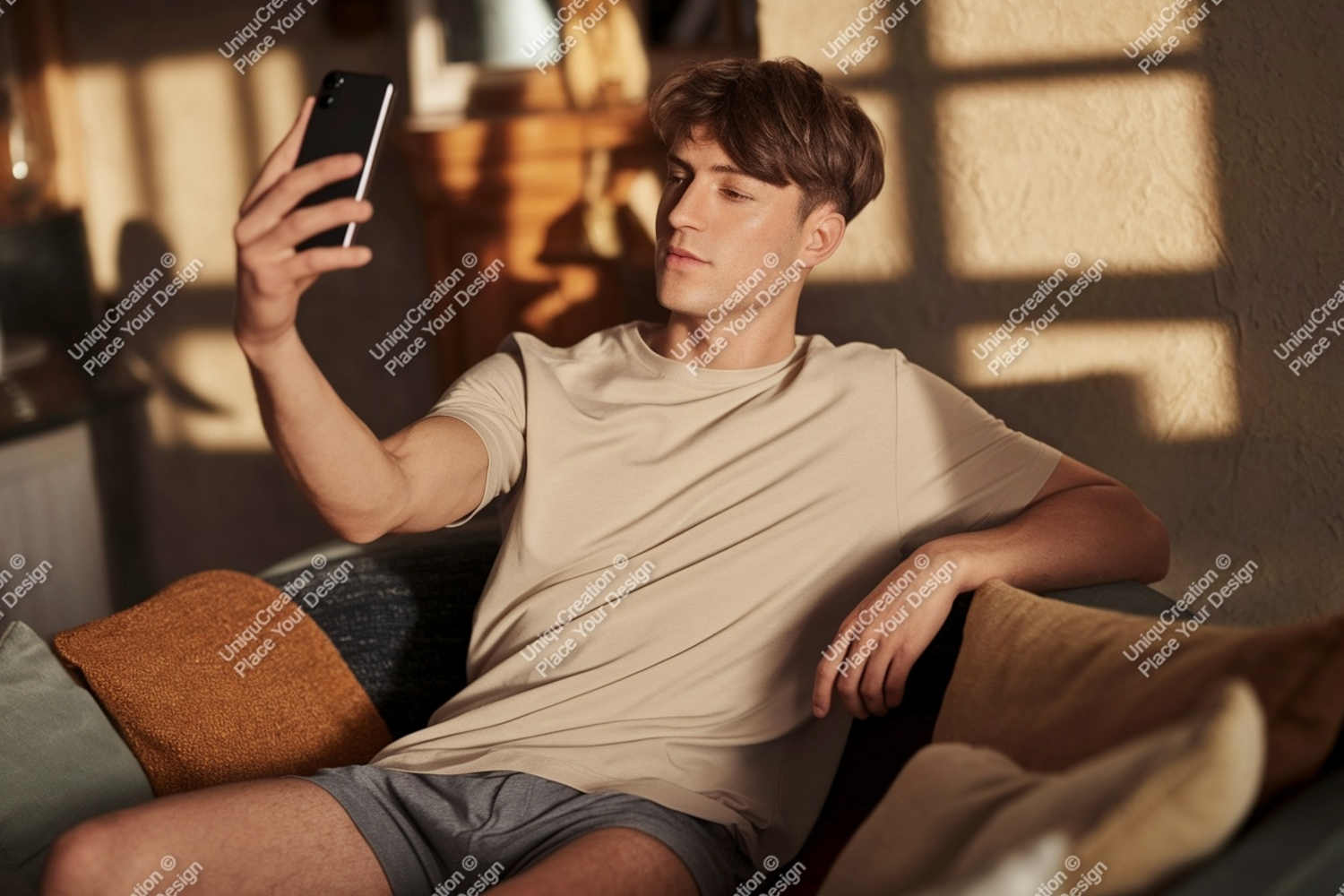 Man Casual Home Phone Shadows Indoor Selfie Sunlight Couch Relaxed