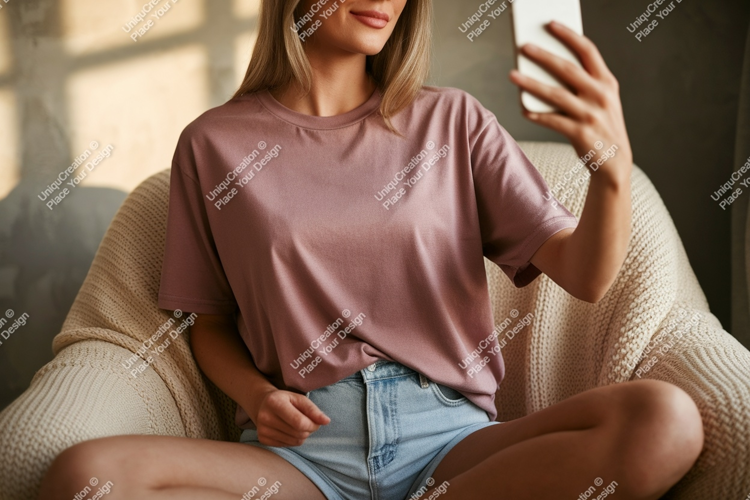 Shirt Pink Casual Woman Chair Blanket Phone Denim Selfie Shorts