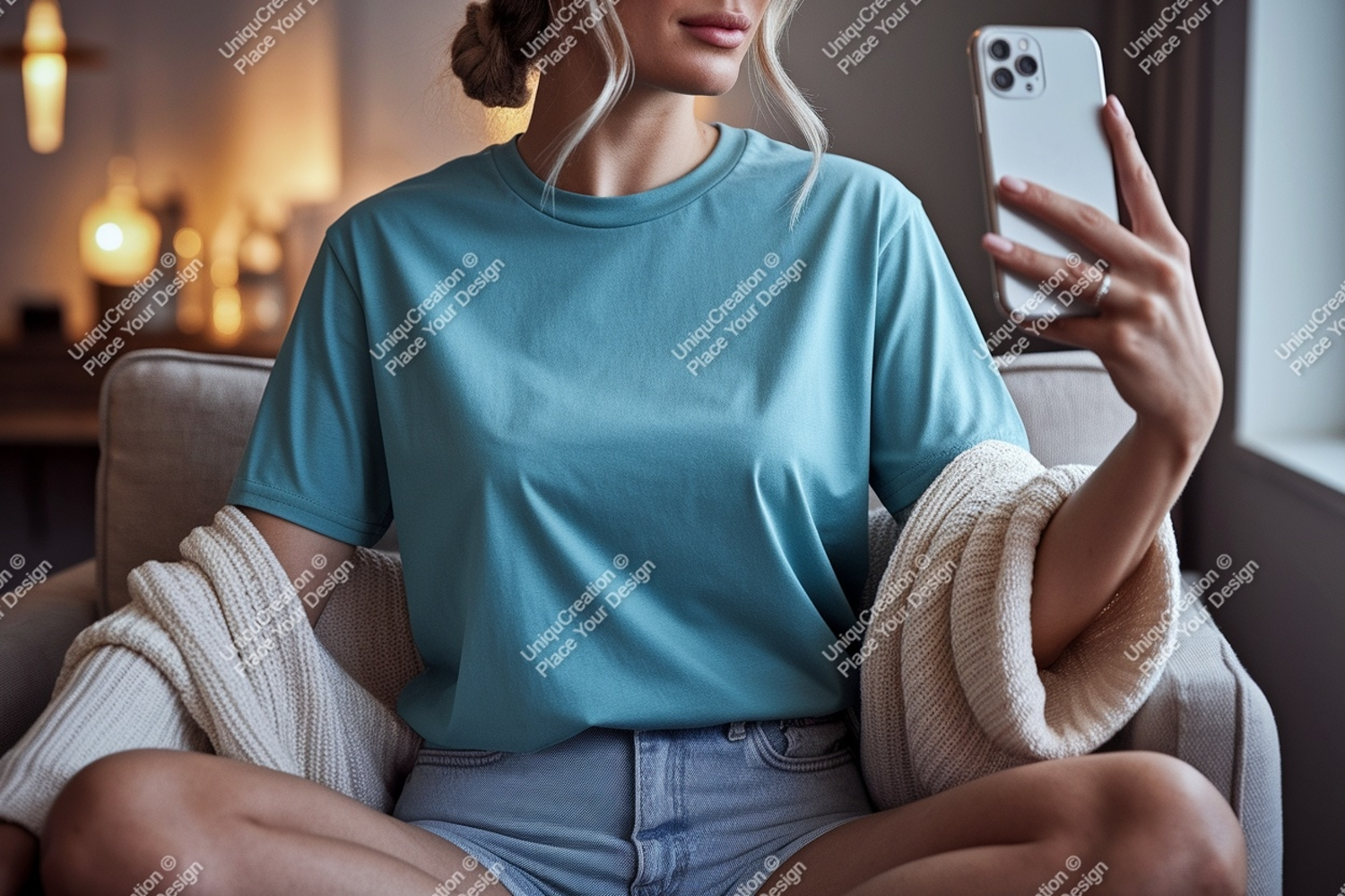 Shirt Casual Woman Blue Sitting Holding Phone T Couch Indoors