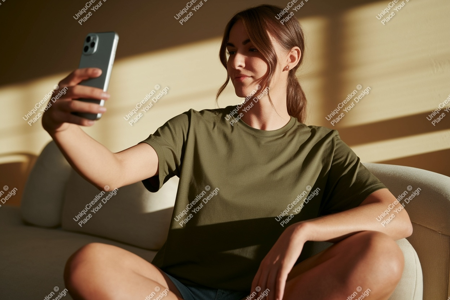 Light T-shirt Casual Green Woman Phone Indoor Selfie Couch Shorts