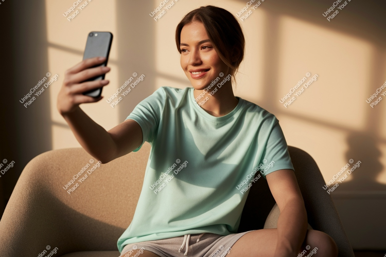 Light Shadow Casual Woman Phone Indoor Comfortable Selfie Couch Relaxed