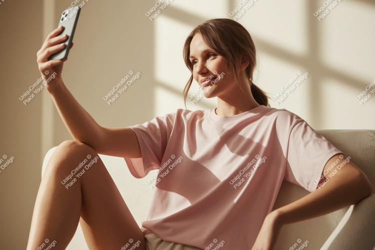 Light T-shirt Pink Casual Woman Phone Indoor Comfortable Selfie Relaxed