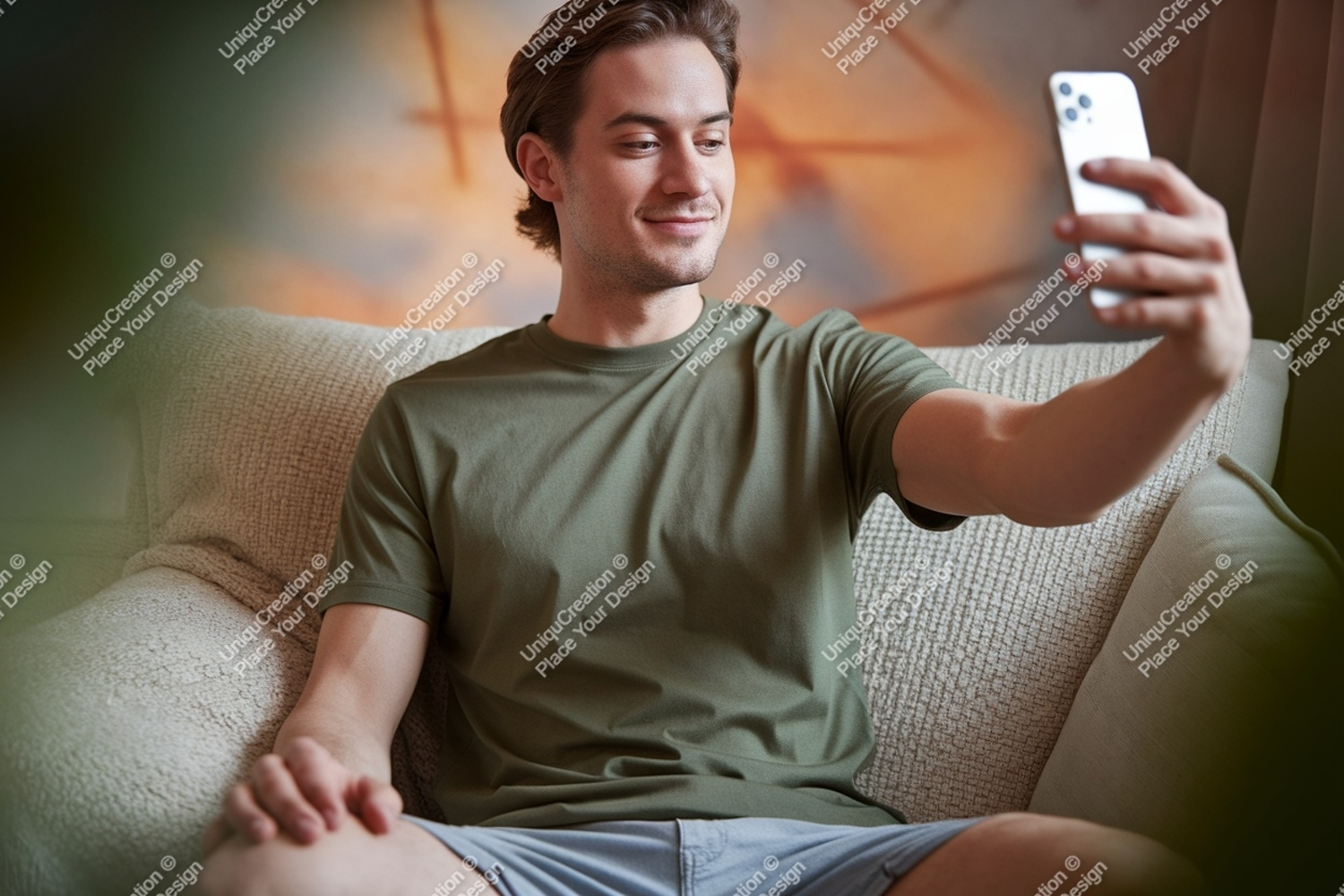 Man Casual Green Home Grey Phone Indoor Selfie Couch Relaxed