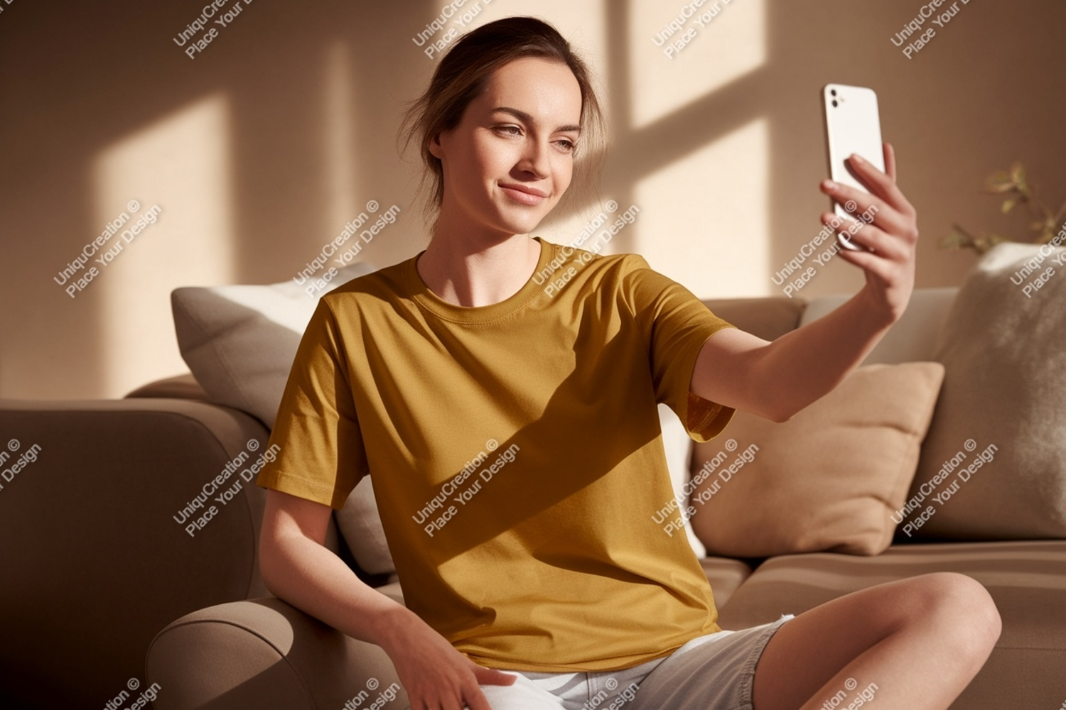 Light Shirt Casual Woman Home Phone T Selfie Couch Mustard