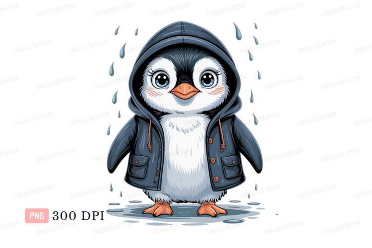 Cute penguin wearing hooded jacket in rain animal bird example image 1