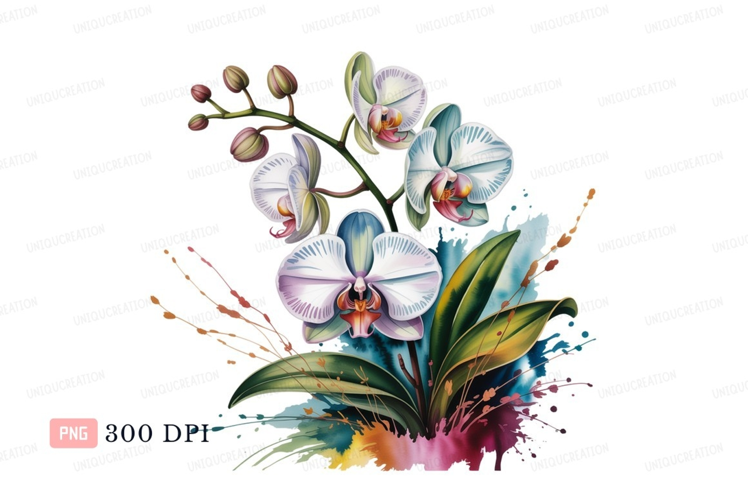 White orchids watercolor splash pink green example image 1