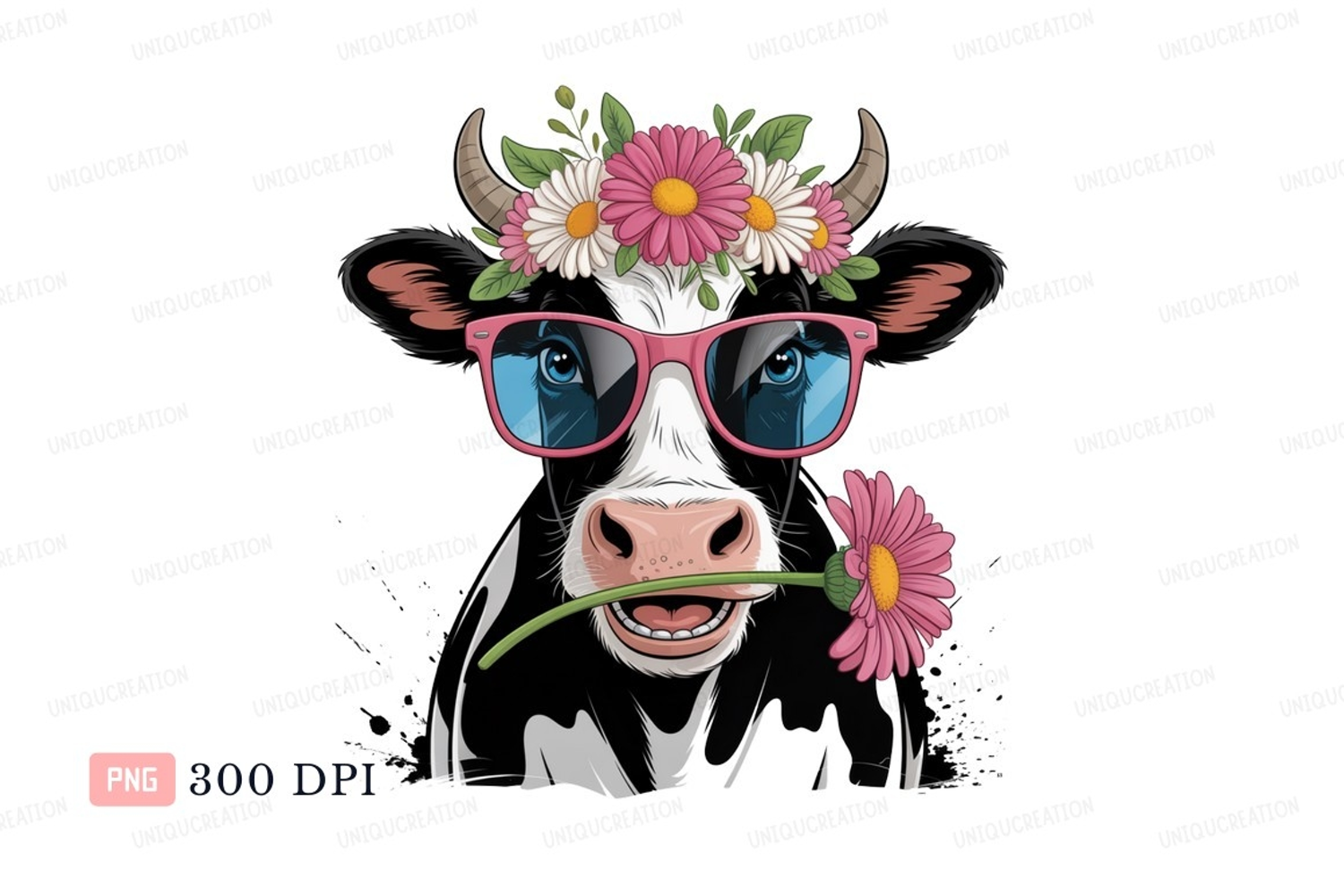 Similar Design Products to Black white cow wearing flower crown pink sunglasses