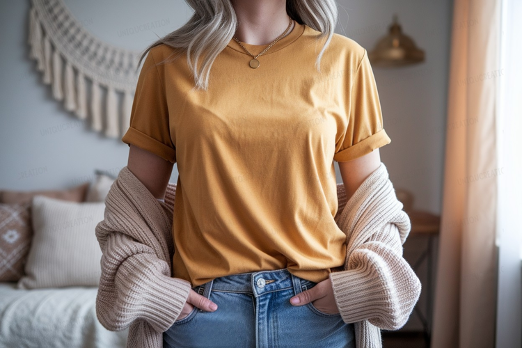 Fashion Shirt Clothing Casual Mockup Apparel Woman Jeans T Mustard