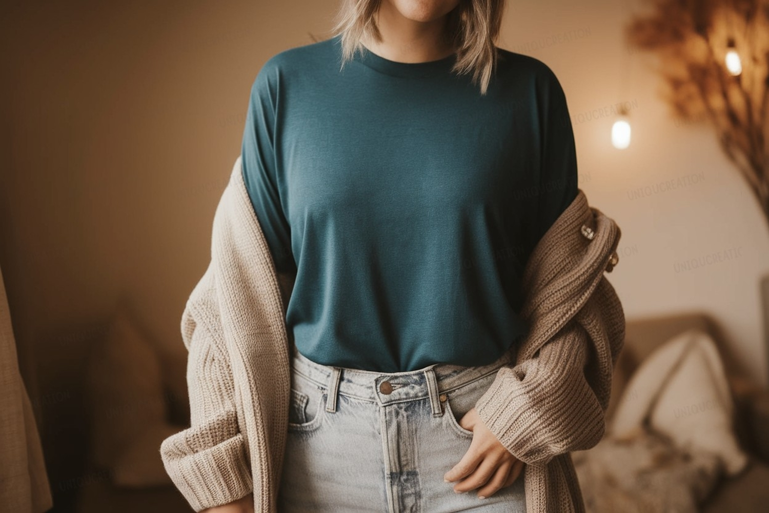 Light Fashion Shirt Clothing Casual Mockup Jeans Teal Neutral Cardigan