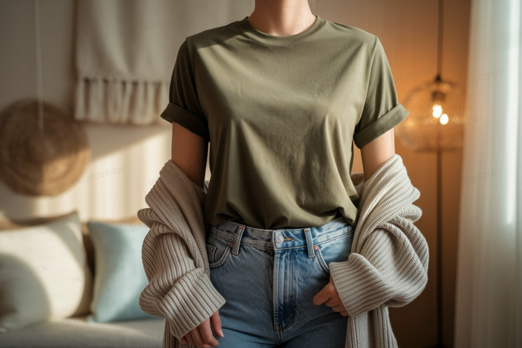 Similar Design Products to Olive green t shirt light wash denim mockup