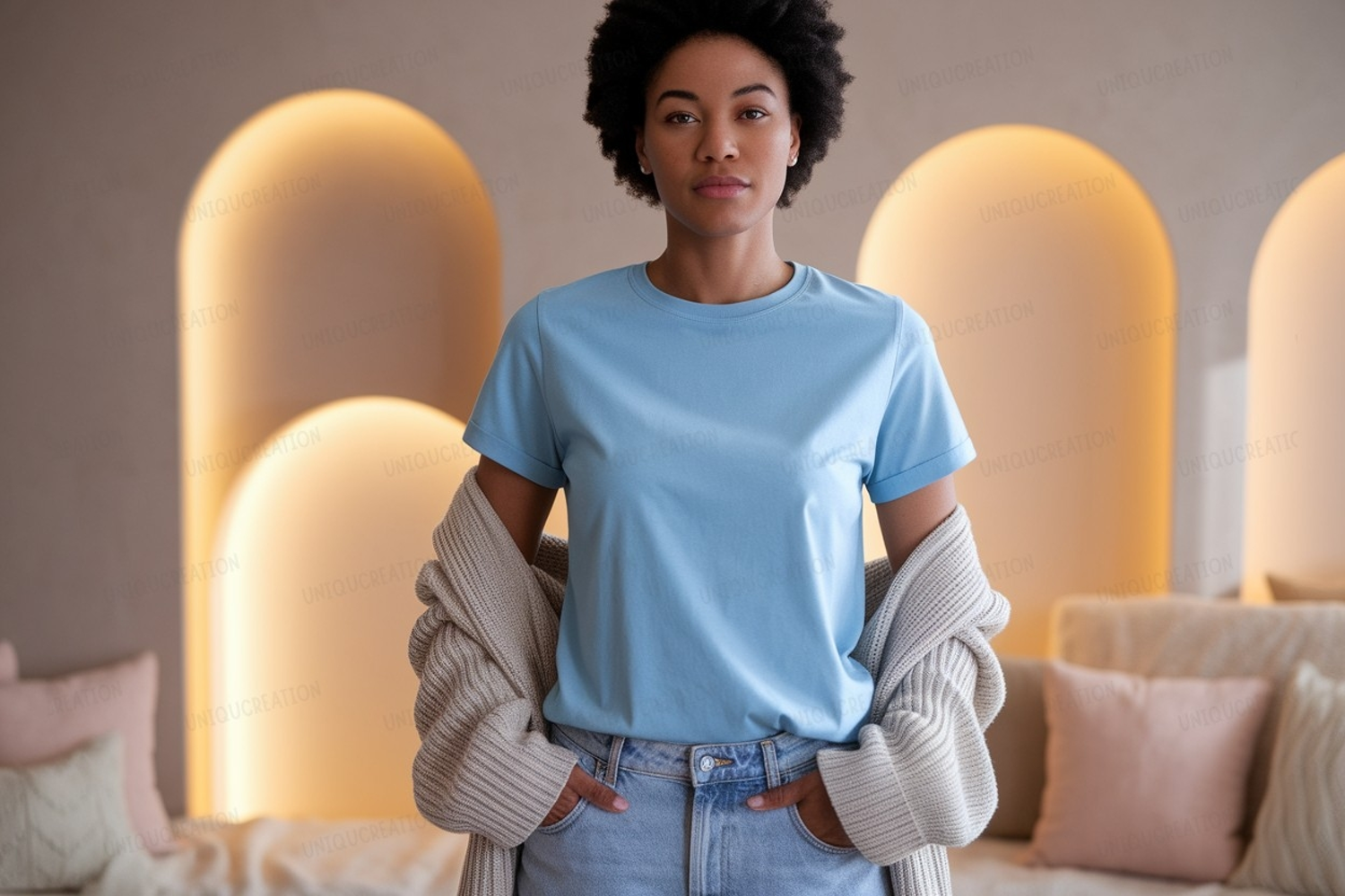 Similar Design Products to Woman wearing blue t shirt and cardigan image