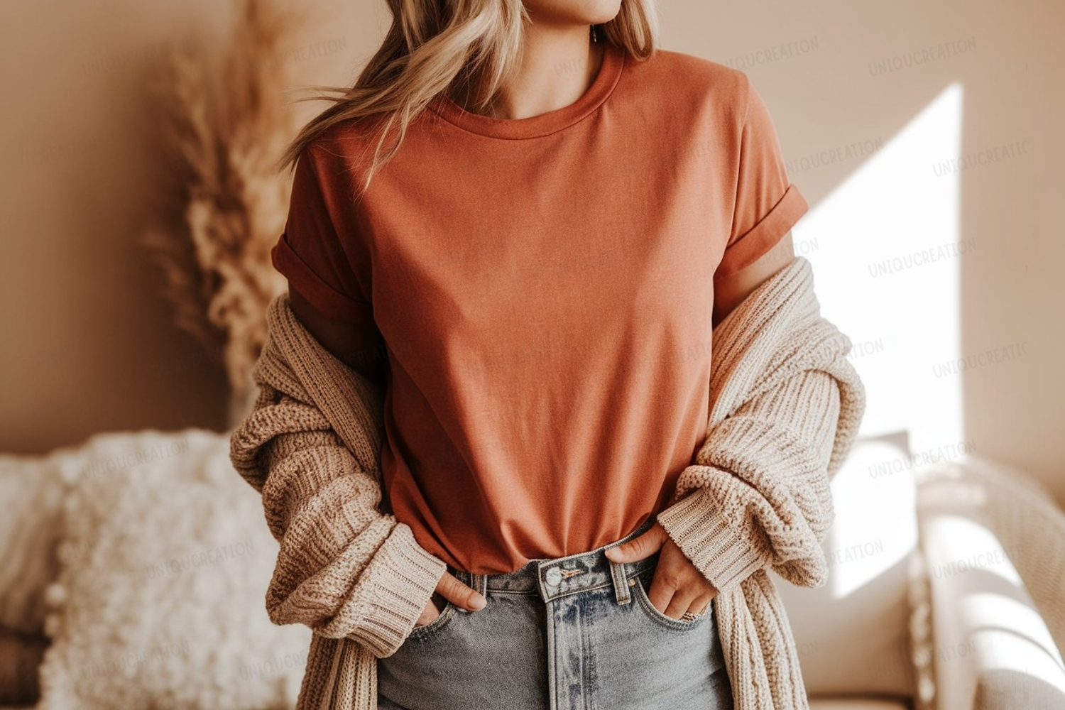 Fashion Clothing Casual Mockup Woman Tee Jeans Cream Cardigan Terracotta