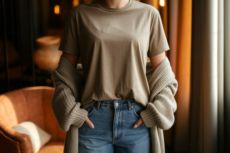 Fashion Clothing Casual Mockup Apparel Tee Blue Jeans Taupe Cardigan