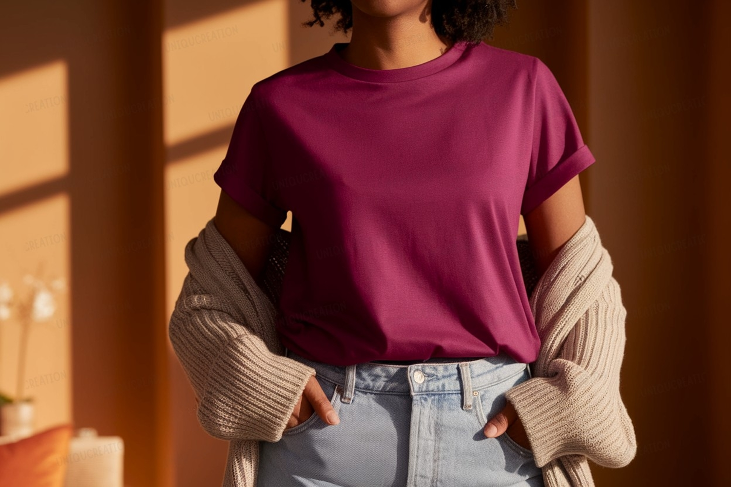 Similar Design Products to Woman wearing magenta t shirt and denim image