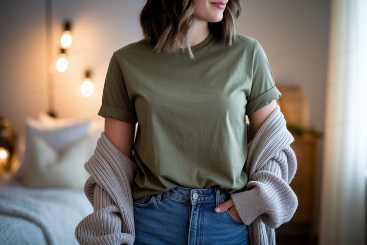 Similar Design Products to Woman wearing olive green t shirt and blue jeans image