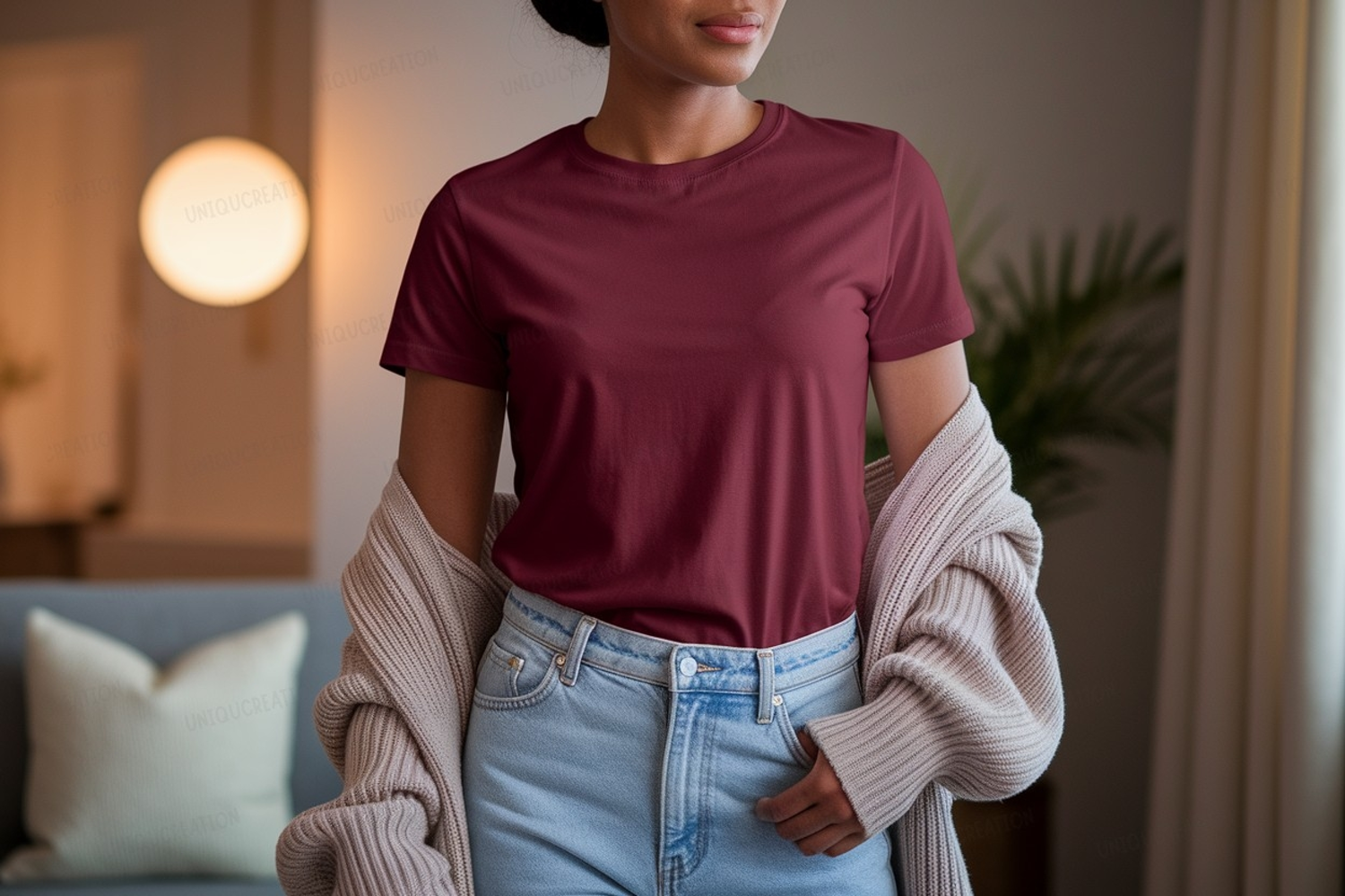 Light Fashion Shirt Clothing Casual Mockup Woman Jeans Maroon Cardigan