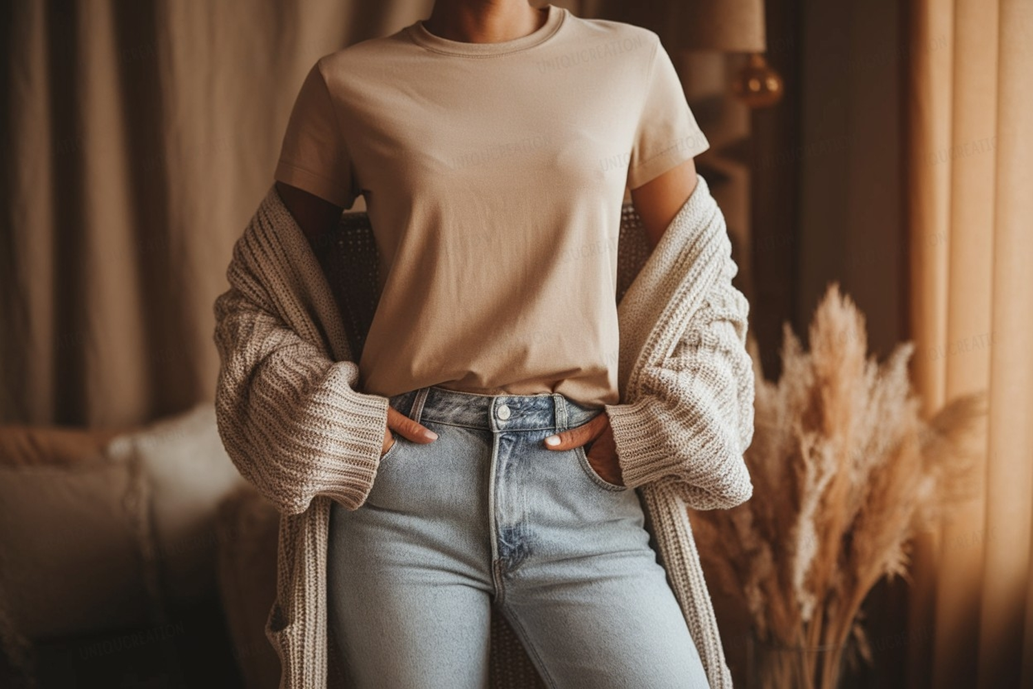 woman, man, female, male, person, fashion, clothing, apparel, casual, style, outfit, modern, chic, elegant, trendy, aesthetic, cozy, comfortable, soft, textured, knitwear, sweater, cardigan, knit, layered, cotton, fabric, stylish, everyday, relaxed, lifestyle, indoor, home, natural, light, shadows, studio, portrait, mockup, display, product, presentation, garment, simple, clean, neutral, background, upper body, torso, model, photo, image, picture, aesthetic, interior, decor, couch, pillows, vase, reeds, room