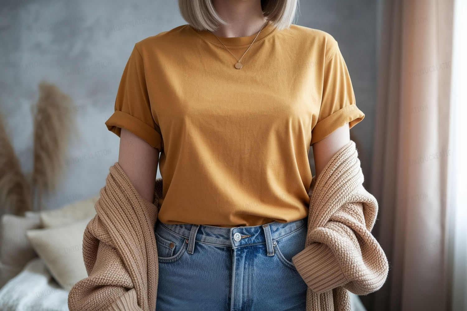 Similar Design Products to Woman wearing mustard t shirt and blue jeans image
