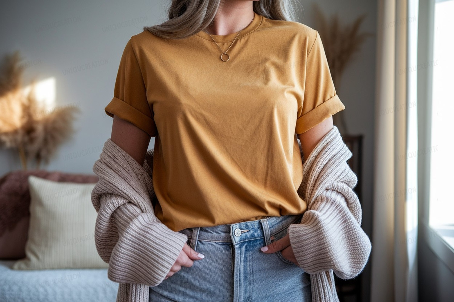 Fashion Shirt Clothing Casual Mockup Woman Jeans T Mustard Cardigan