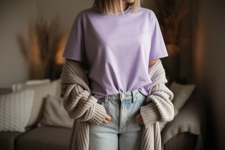 Lavender shirt light jeans cozy cardigan mockup apparel example image 1