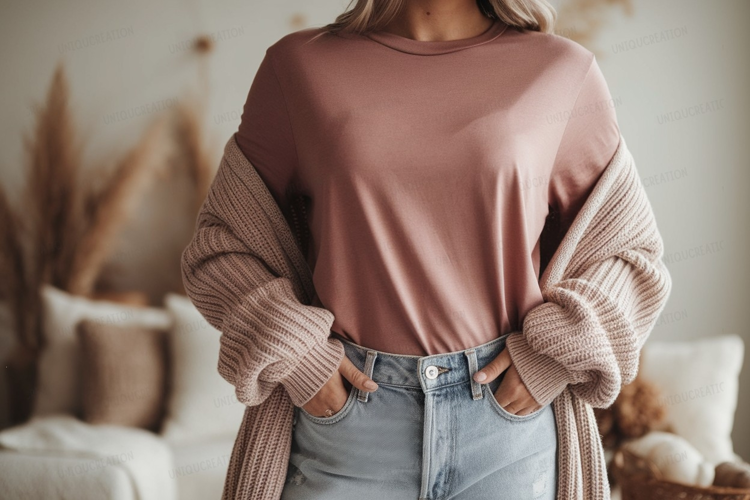 Fashion Shirt Pink Clothing Casual Mockup Woman Jeans Cozy Cardigan