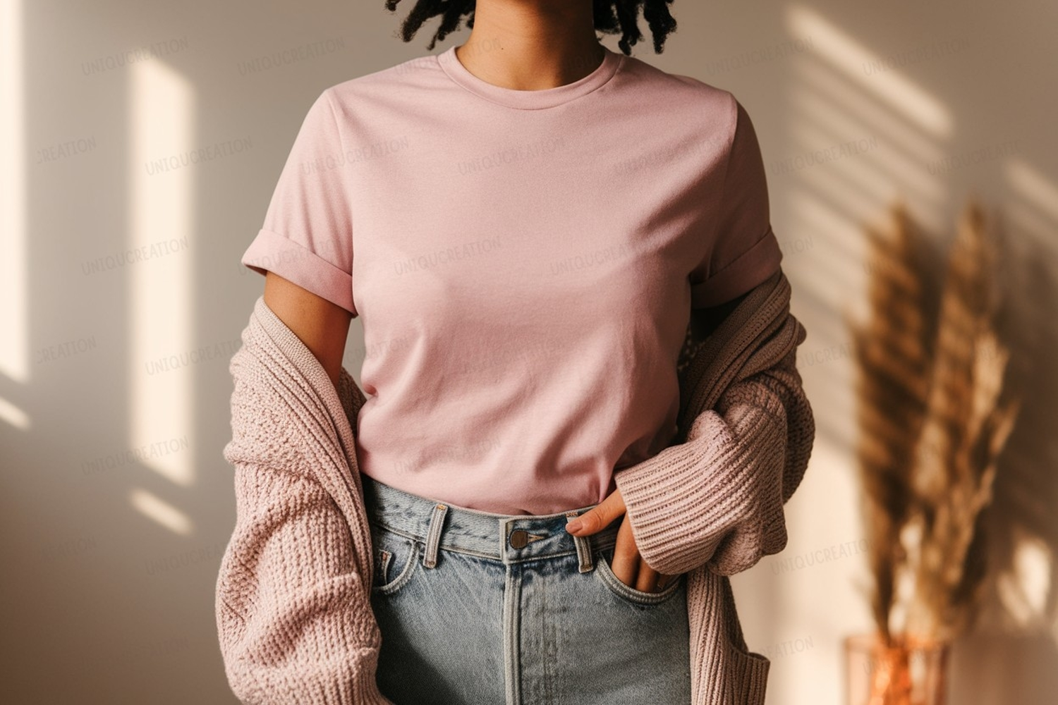 Pink shirt blue jeans cardigan mockup apparel example image 1