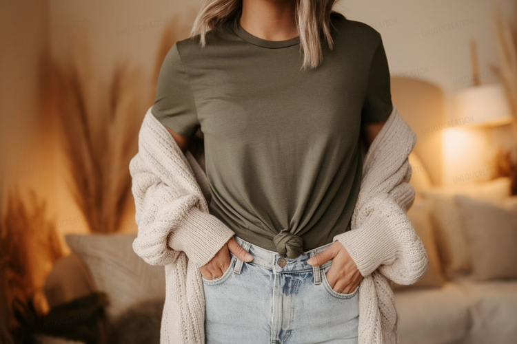 Light Fashion Clothing Casual Mockup Tee Olive Denim Outfit Cardigan