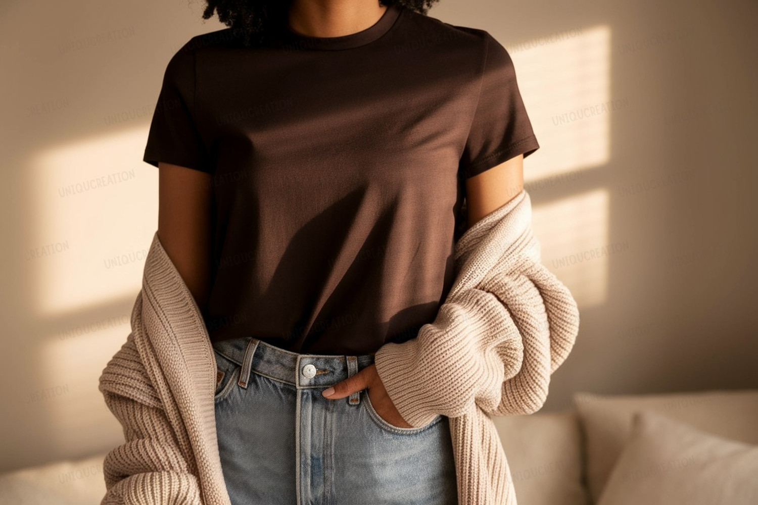 Similar Design Products to Woman wearing brown t shirt and denim jeans image