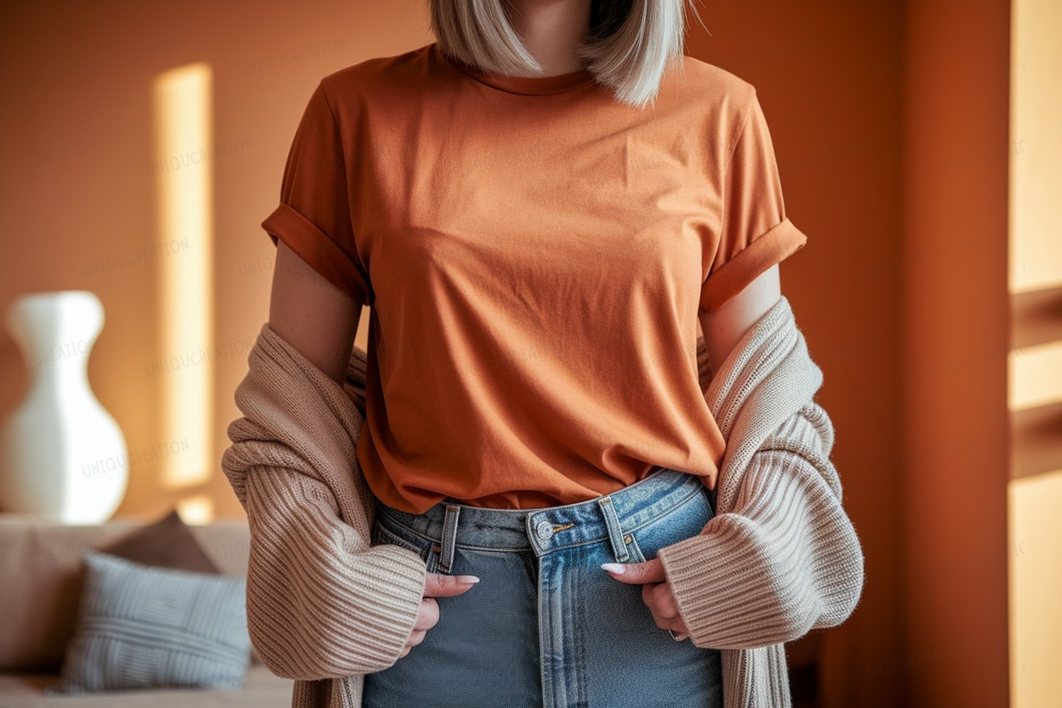 Similar Design Products to Orange shirt blue jeans cardigan image