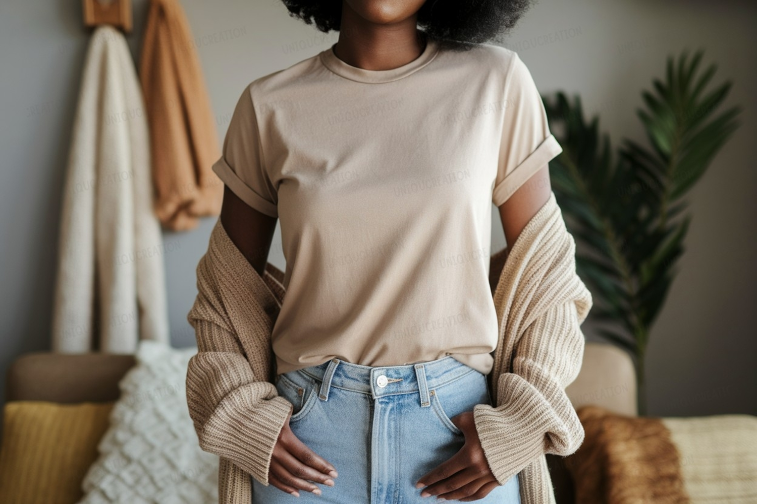 Similar Design Products to Woman wearing beige t shirt and jeans image