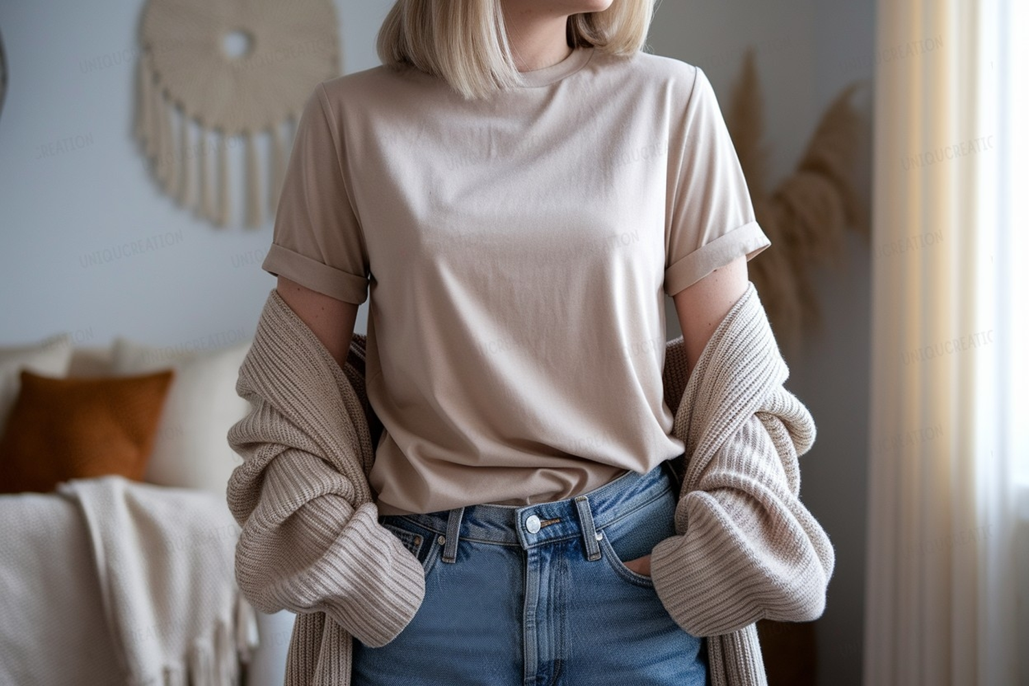 Similar Design Products to Woman wearing beige t shirt and denim image