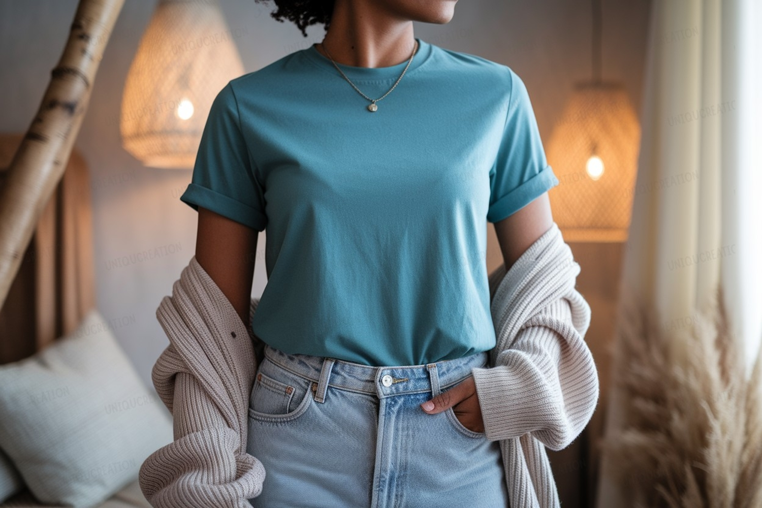 Light Fashion Shirt Clothing Casual Mockup Woman Jeans Teal Cardigan